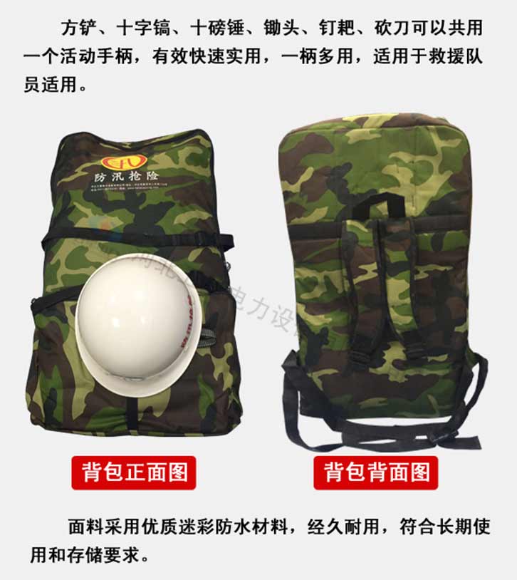 防汛組合工具包19件套:鎬、鈀、鋤頭、十磅錘、砍刀、方鏟、電筒、水鞋、防汛戰(zhàn)斗服、防寒雨衣、救生繩、雙背帶、救生衣、毛巾、水壺、頭盔、消防斧頭、信號燈、工具包。該組合工具包輕便、工具配備齊全適用于救援隊員使用。