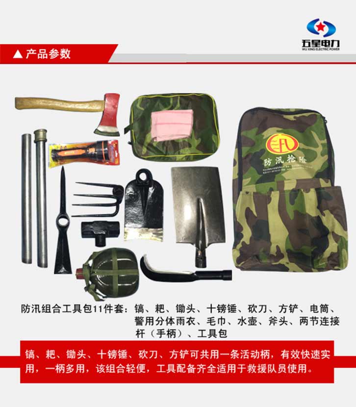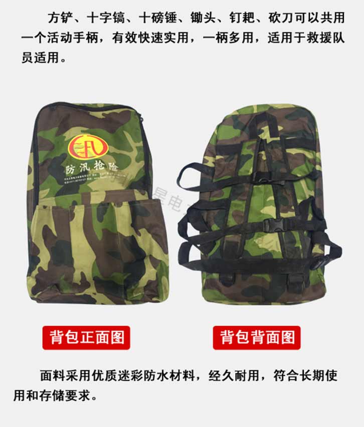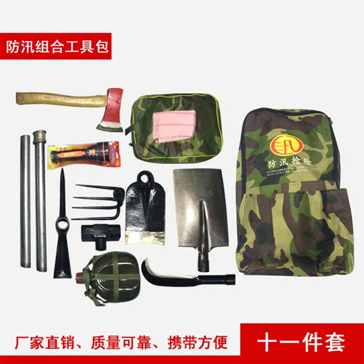防汛組合工具包十一件套:鎬、鈀、鋤頭、十磅錘、砍刀、方鏟、電筒、警用分體雨衣、毛巾、水壺、頭盔。共用一條活動(dòng)柄。該組和輕便,工具配備齊全適用于救援隊(duì)員使用。