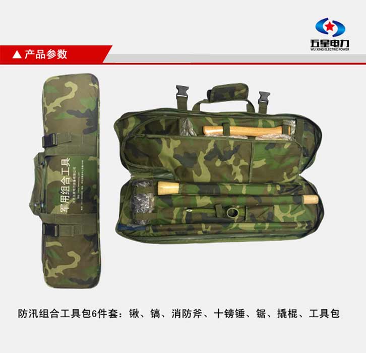 防汛組合工具包六件套:鍬、鎬、消防斧、十磅錘、鋸、撬棍、兩節(jié)連接桿、工具包。一柄多用,適用于消防隊員使用