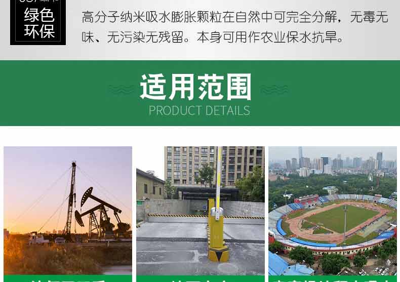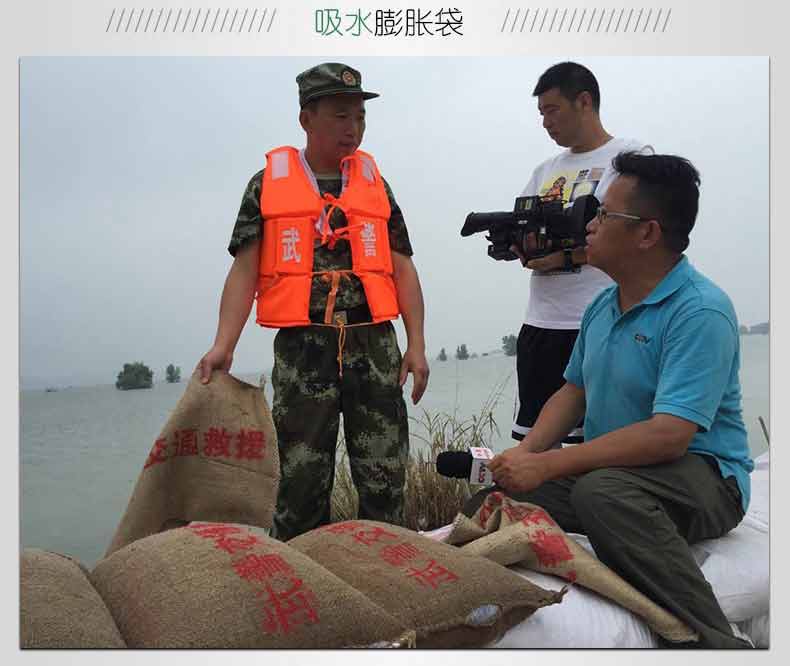 采用以水治水的新理念:在防汛搶險(xiǎn)緊急時刻無處尋找砂石土料,可以將吸水膨脹袋放入水中,3分鐘可迅速膨脹到20-25公斤,代替人工裝沙填土的防汛沙袋時代,也可以直接將吸水膨脹袋投放到管涌口,快速封堵堤壩管涌,廣泛用于防洪搶險(xiǎn),堤壩管涌,河堤堵漏,堤防漏洞、漫溢搶護(hù),防洪堤防的臨時性加高,臨時性防水圍城的構(gòu)筑,水庫,江河大堤滲水滑坡,護(hù)坡防沖,工程截流,暗溝和暗洞的堵塞。用于庫房,庭院,溝塘,被淹耕地排水;用于容易淹水的工廠,隧道,地下停車場,地鐵等領(lǐng)域作為防落水的使用;用于市政設(shè)施、道路施工,工地橋梁建設(shè),競賽場地等積水處吸水去水。是我國各地水利,水務(wù),防汛辦,防汛物資儲備及市政排水,和城市易澇區(qū)必備的應(yīng)急防汛儲備物資。