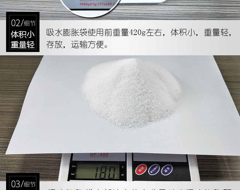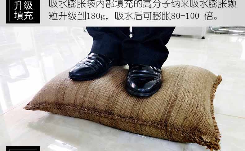 吸水膨脹袋內(nèi)裝的是新型的高分子納米吸水物質(zhì),這種物質(zhì)無毒、無味、無污染,吸水膨脹前為極小的顆粒物質(zhì),吸水后為黑豆大小的含水物質(zhì),干凈且無公害,待高分子吸水物質(zhì)使用后可用于農(nóng)業(yè)保水抗旱,所以在洪水過后可就地將袋內(nèi)的物質(zhì)傾倒入農(nóng)田中,在泥土中可完全分解,是綠色環(huán)保、一舉兩得的首選產(chǎn)品。外袋為純麻布和棉布織成,遇水后麻繩可更加結(jié)實(shí)耐磨。