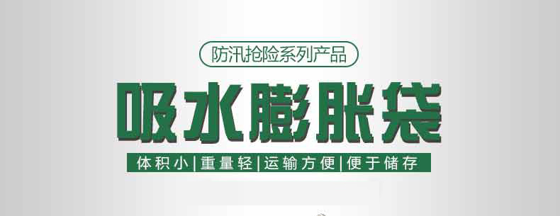 膨脹防洪袋,使用前體積小,重量輕,存放,運(yùn)輸方便。與傳統(tǒng)的沙袋相比,在搶險(xiǎn)防洪時大大減小時間和人力,另防洪搶險(xiǎn)更有效率。吸水膨脹袋屬環(huán)保產(chǎn)品,無毒,無害,無味,無污染??勺匀唤到?。