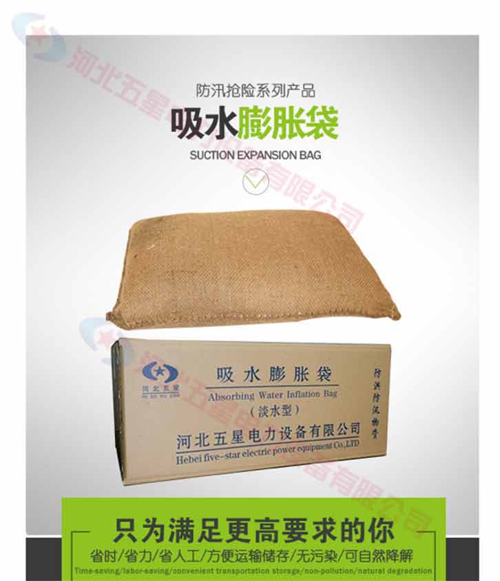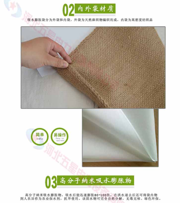 吸水膨脹袋內(nèi)裝的是新型的高分子納米吸水物質(zhì),這種物質(zhì)無毒、無味、無污染,吸水膨脹前為極小的顆粒物質(zhì),吸水后為黑豆大小的含水物質(zhì),干凈且無公害,待高分子吸水物質(zhì)使用后可用于農(nóng)業(yè)保水抗旱,所以在洪水過后可就地將袋內(nèi)的物質(zhì)傾倒入農(nóng)田中,在泥土中可完全分解,是綠色環(huán)保、一舉兩得的首選產(chǎn)品。外袋為純麻布和棉布織成,遇水后麻繩可更加結(jié)實(shí)耐磨。