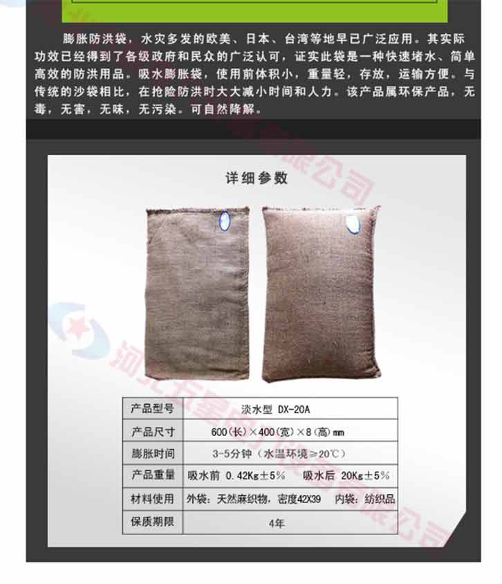 膨脹防洪袋,使用前體積小,重量輕,存放,運(yùn)輸方便。與傳統(tǒng)的沙袋相比,在搶險(xiǎn)防洪時(shí)大大減小時(shí)間和人力,另防洪搶險(xiǎn)更有效率。吸水膨脹袋屬環(huán)保產(chǎn)品,無毒,無害,無味,無污染??勺匀唤到?。