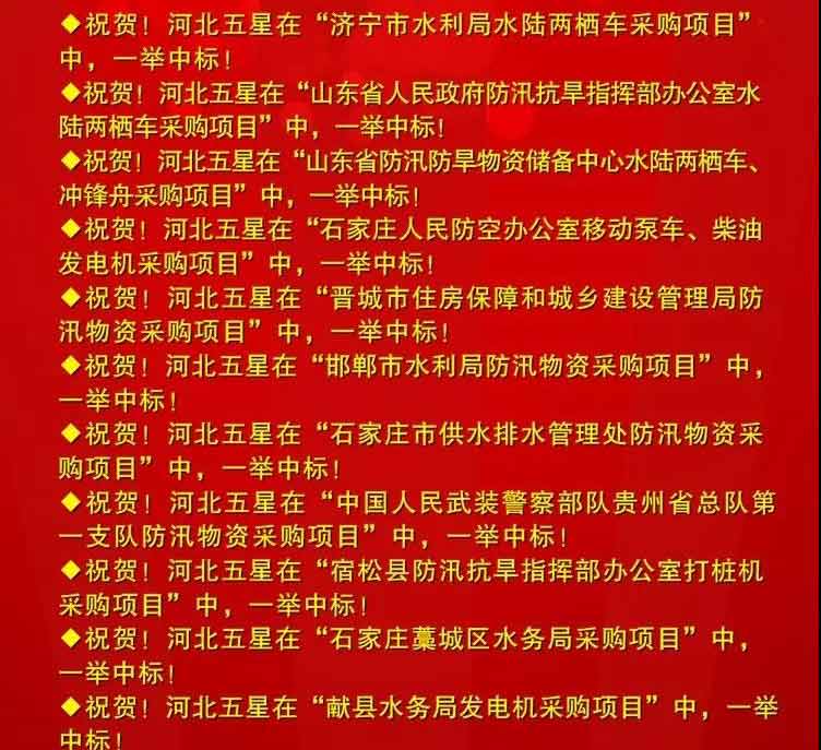 是我國防汛抗旱、搶險救災、應急減災救援和電力設備及安全工器具、市政設施、地下管網行業(yè)中,集科研、開發(fā)、生產、銷售及服務于一體的現(xiàn)代化技術裝備高新技術企業(yè)。我公司多次中標項目,榮譽成就屬于過去,河北五星永駐輝煌。